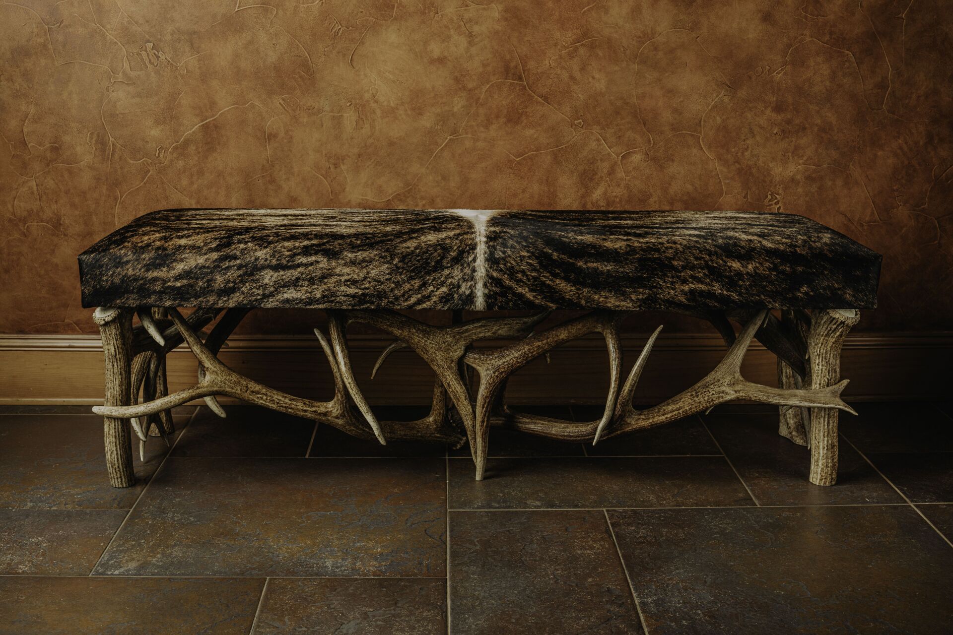 Perfect for the foot of a King size bed, in an entryway or mud room.......or anywhere you need additional seating. It is functional and beautiful at the same time. Each bench varies based on the cover and the Antler design. The legs are always elk but the design accents can be done from any type of antler. First photo shows leather cover with elk and moose base. Second photo shows cowhide cover with elk base.