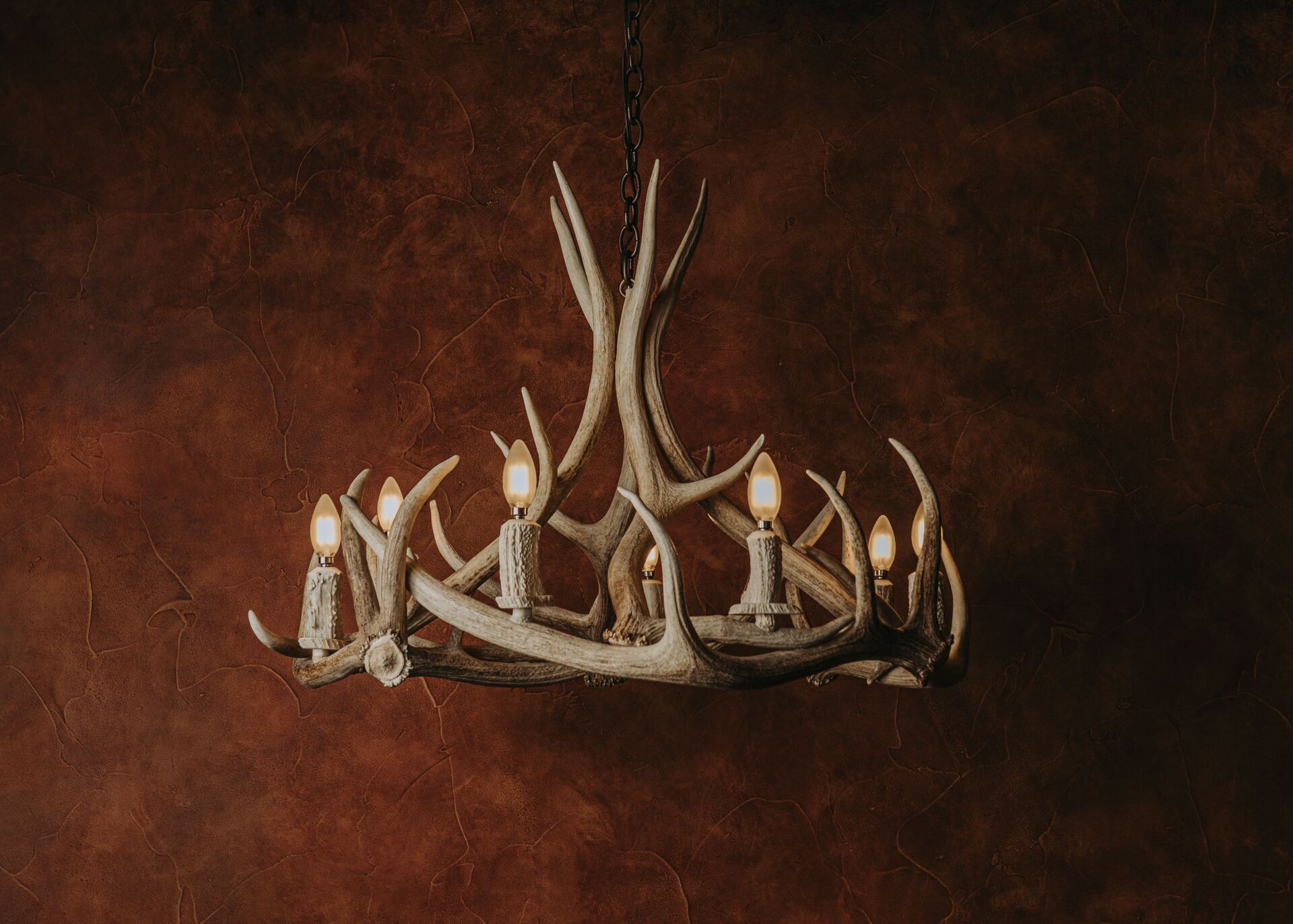 Small open bottom natural elk chandelier 32 inches wide by 26 inches tall with 7 lights. The open bottom allows you to look up through the chandelier and appreciate each antlers beauty. This chandelier works great in a space that has a lower ceiling but still needs some width. Comes with 3' of chain but additional is available for purchase. Also available in Natural, Bleached and we can add shades to the lights.