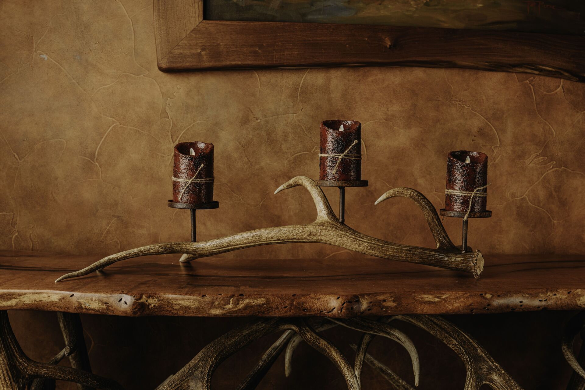 Elk centerpiece holds 3 candles with rusted cups. Looks awesome as a centerpiece on a dining table, coffee table or on a mantle. You can put 2-3 together to fill a larger space. Makes a great gift!