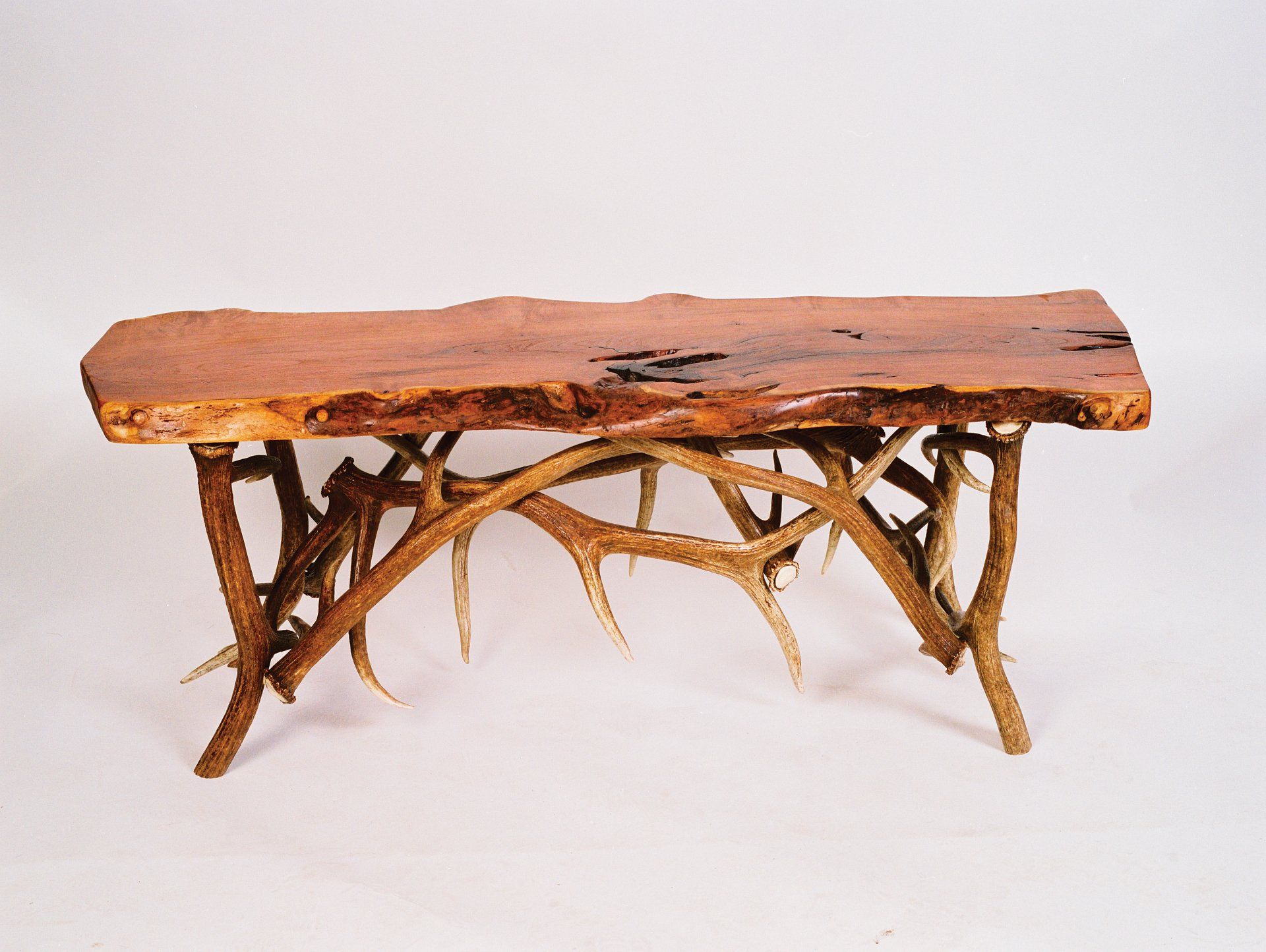 Mesquite bench.This natural edge mesquite is harvested from South Texas. Each piece of wood is different and exudes it’s own beauty. Base is from all naturally shed elk antlers. This would make a great piece for an entryway, mud room, by the fireplace or at the foot of the bed.