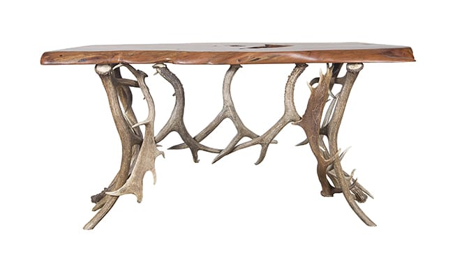 Mesquite wood sofa table. This natural edge mesquite is harvested from South Texas. Each piece of wood is different and exudes it’s own beauty. Each table varies in design. Elk are always used as the legs but we use whitetail, mule deer, elk, moose, fallow or red stag for the front accents. Each piece is it’s own work of art. If you need it smaller or larger, no problem, we can custom build based on your needs and preferences on type of Antler. Looks great behind a sofa or in an entryway/hallway.